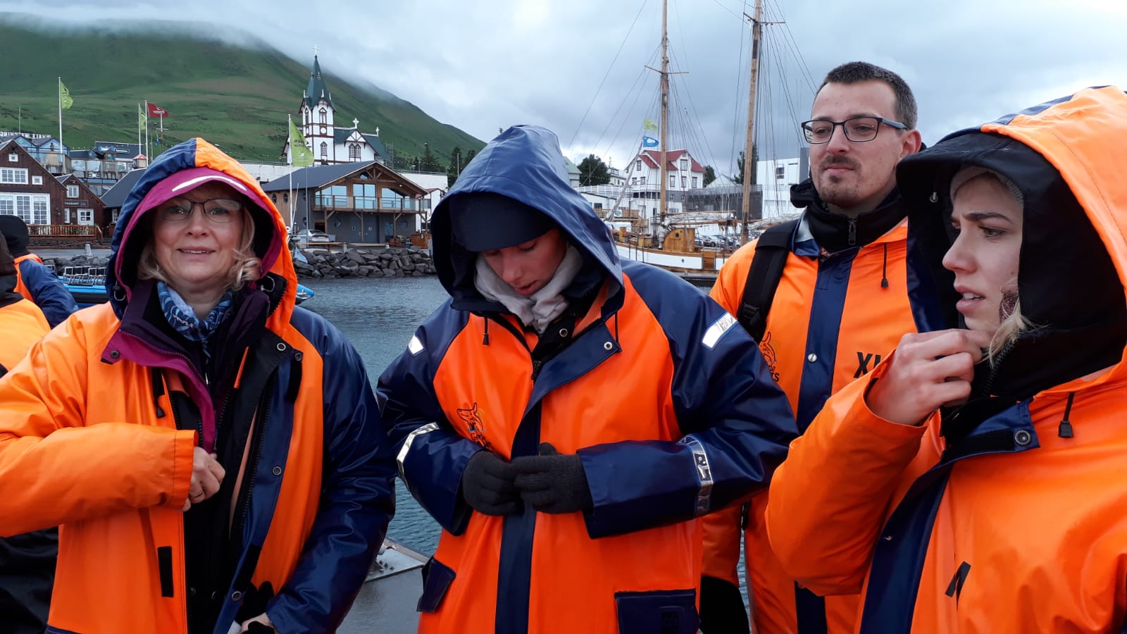Heute startet unser aufregendstes Abenteuer. Unsere Fahrt nach Húsavík. Die schneebedeckte Kuppe des Berges Kaldbakur begrüßte uns bei leichtem Nieselregen. Am Anfang des Hafens leuchteten bunte Schilder mit Fischen, Kraken, Nixen, Kobolden, usw. und brachte uns noch mehr in unternehmungslustige Stimmung.