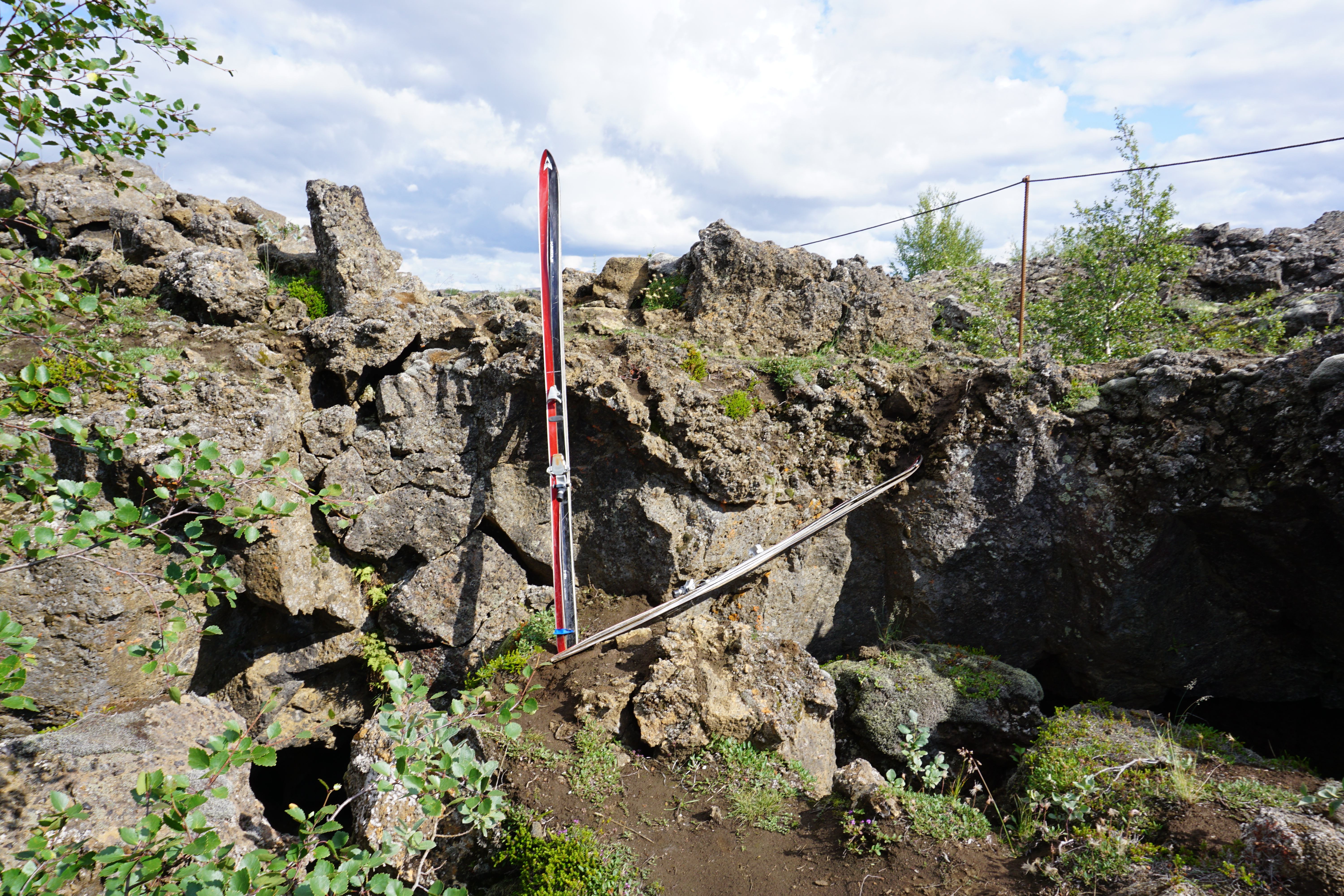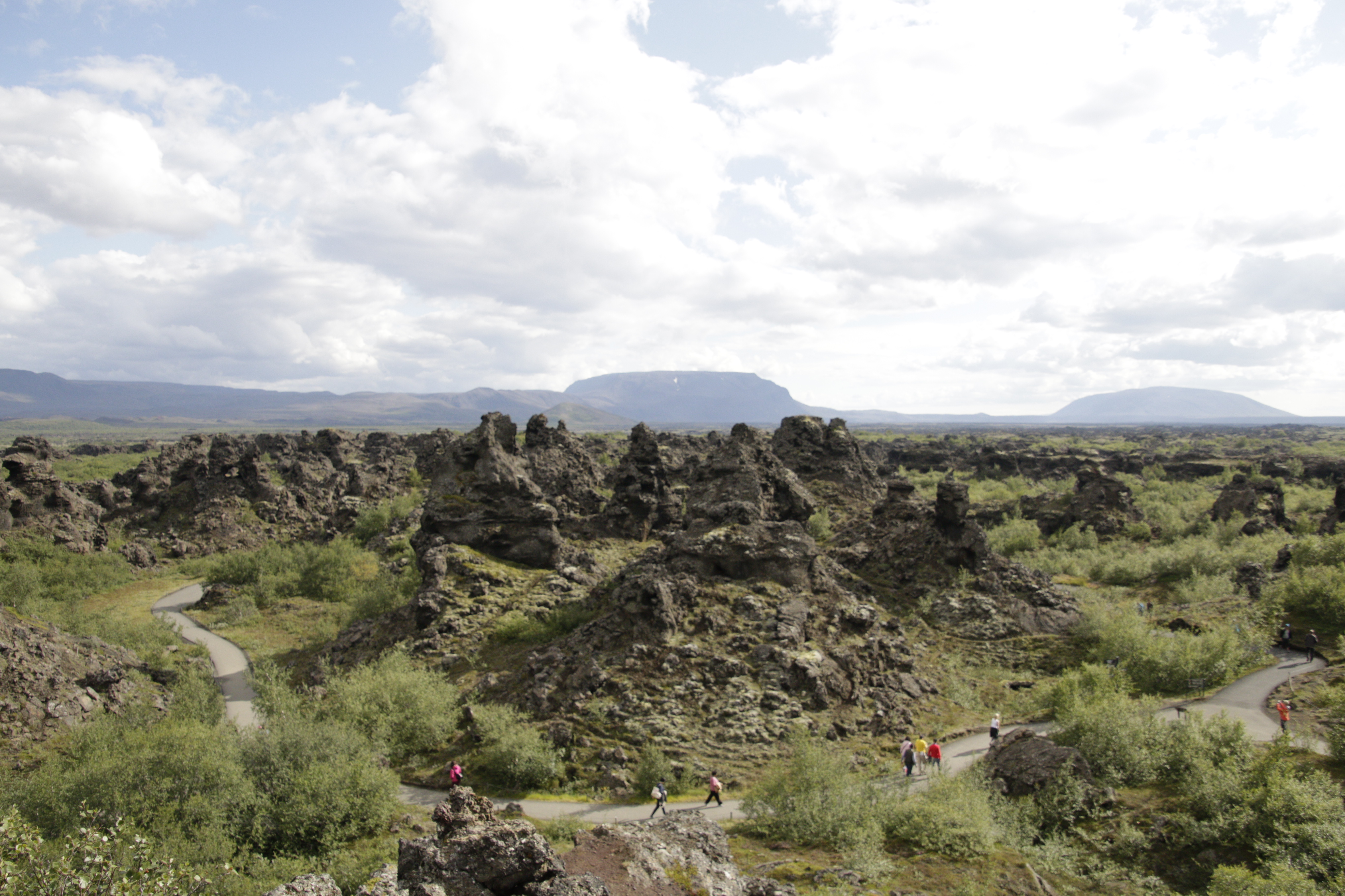 Dimmuborgir wurde als nächstes angefahren. Ist ein Lavafeld mit bizarren Felsformationen, die auch aufgrund ihres Aussehens Bezeichnungen hatten, wie Weihnachtsmannstuhl oder Kirche. Die Kirche konnte man als solche erkennen. Sie hatte ein Eingangsportal, geformt wie am Erfurter Dom. Es gab auch Emporen, die die Lava gebildet hatte. Der Weihnachtsmannstuhl war eine Höhle, die man als "Gruselkabinett" bezeichnen konnte. Felle von Schafen, künstliche Knochen, Kochgeschirr, usw.!