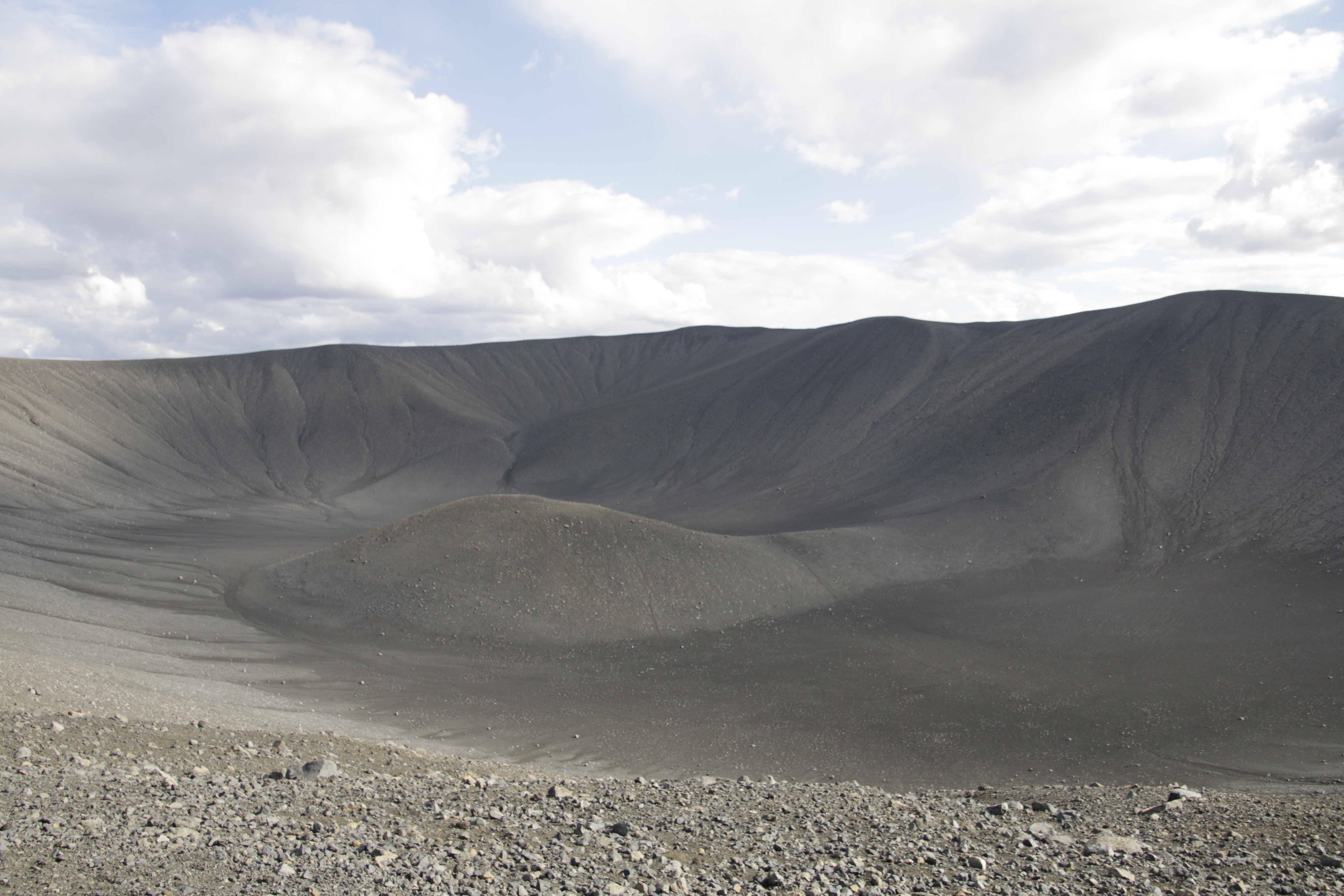 Der Vulkankrater Hverfjall lockte mit einem Aufstieg. Es war ein tolles Erlebnis in den Schlund des Vulkans hineinzuschauen. Wann sieht man als "Ottonormalverbraucher" schon so ein Bild. Deshalb habe ich als ältere Dame den Aufstieg auch in Angriff genommen. Die Jugend stürmte voran, der Herr Schwiegersohn heftete sich an meine Fersen. Ich schickt ihn aber auch zu der Jugend, damit er mein Keuchen nicht hören sollte. Natürlich verkündete er ganz laut seinen Nachkommen, dass Oma japst wie ein Elefant. Ich habe es aber trotzdem geschafft und wir sind alle mit einem wunderschönen Blick in und vom Berg belohnt worden.