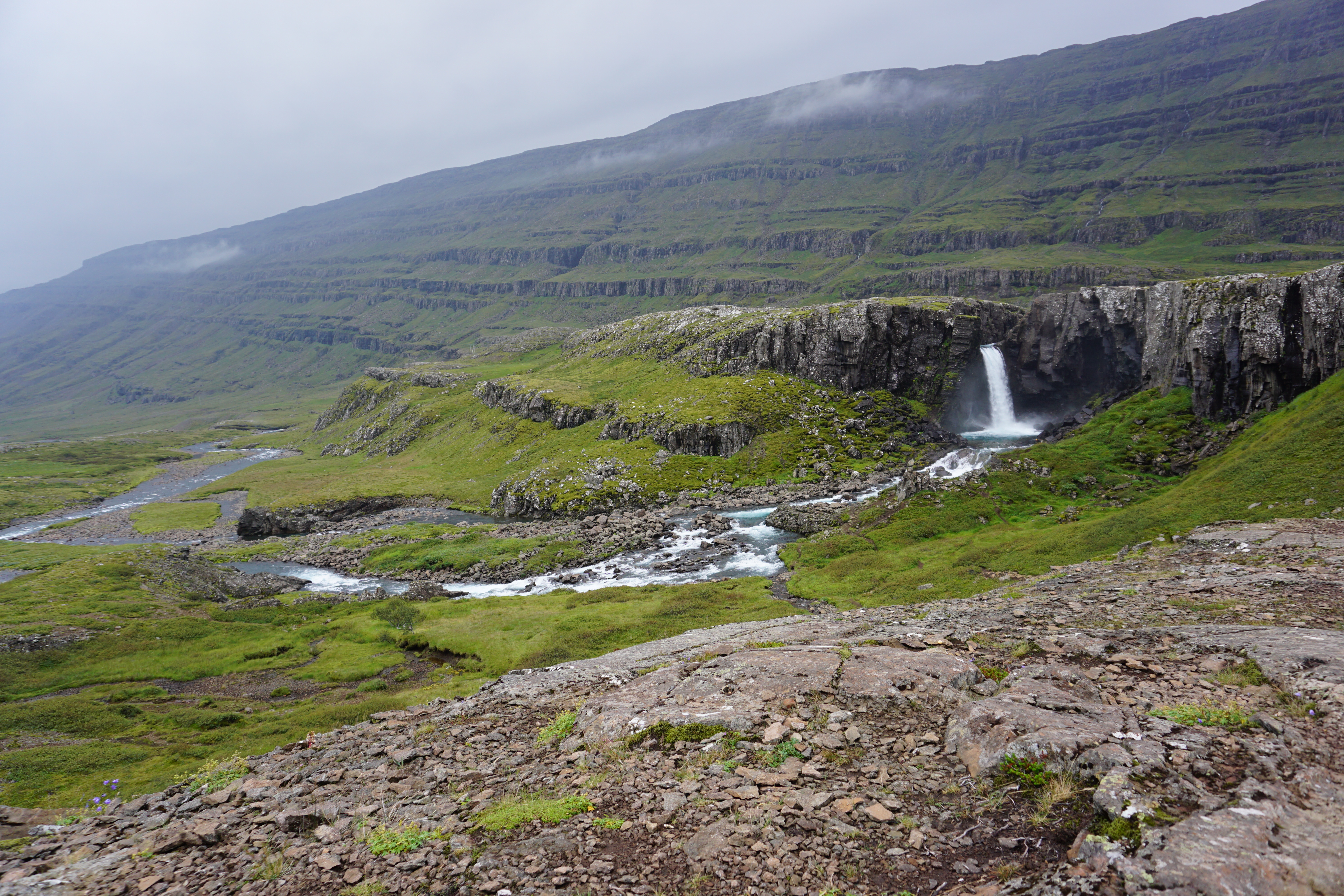 Nach mehreren Stunden Fahrt, war unser erster Hot Spot das Toillettenhäuschen. Diese Häuschen sind praktischerweise an vielbefahrenen Stellen nutzbar. Dann erreichten wir den Vatnajökull Nationalpark. Hohe Berge mit aus dem Nebel ragenden Spitzen begrüßten uns. Nach einem kurzen Fotostop hatten die Wolken die ganzen Berge schon wieder eingehüllt und unsichtbar gemacht. Dann parkten wir am Svartifoss-Wasserfall. Doch hier hätten wir mindestens zwei Stunden Zeit haben müssen (Weg hin und zurück). Da wir aber noch eine lange Fahrt vor uns hatten, mussten wir dieses Unterfangen aufgeben.