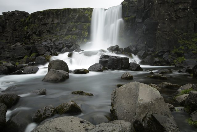 Eric fuhr uns zum Wasserfall Seljalandsfoss. Bei diesem Fall konnten wir auch die Rückseite betreten. Die Felswand war aufgrund der hohen Luftfeuchtigkeit mit Flechten, Moosen und Farnen bedeckt.