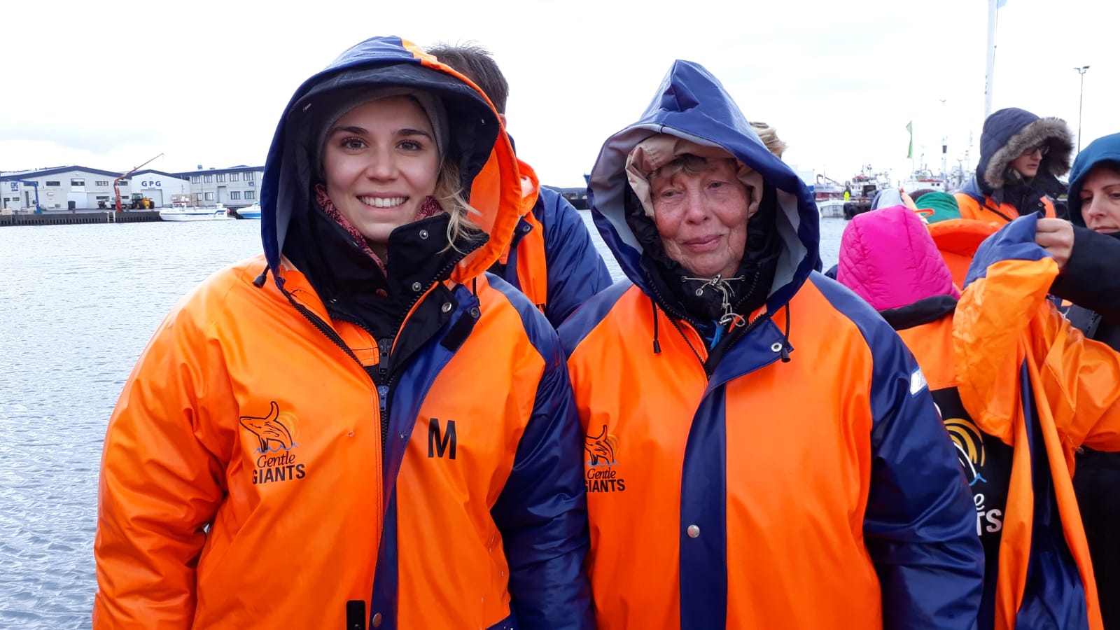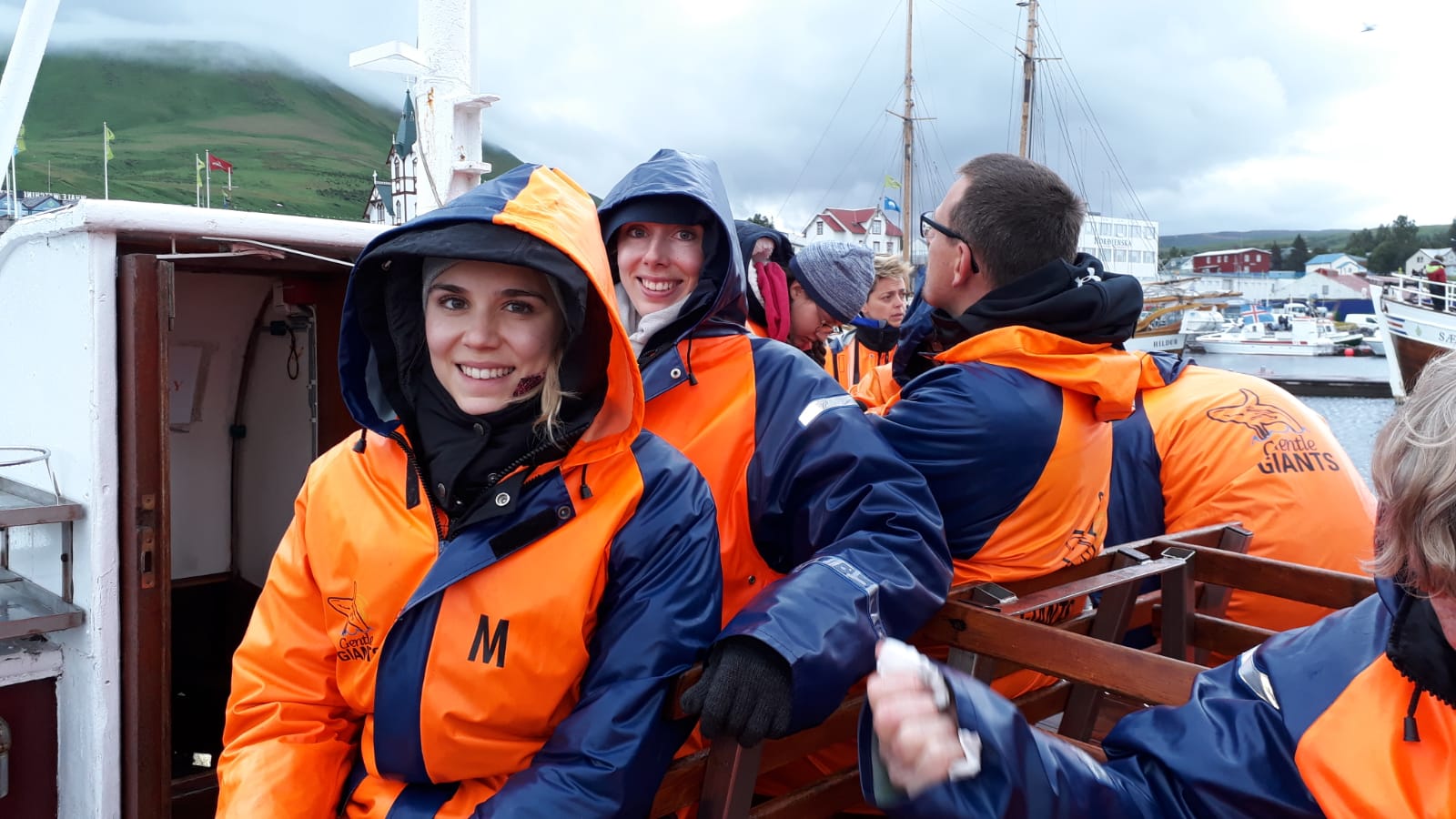 Heute startet unser aufregendstes Abenteuer. Unsere Fahrt nach Húsavík. Die schneebedeckte Kuppe des Berges Kaldbakur begrüßte uns bei leichtem Nieselregen. Am Anfang des Hafens leuchteten bunte Schilder mit Fischen, Kraken, Nixen, Kobolden, usw. und brachte uns noch mehr in unternehmungslustige Stimmung.