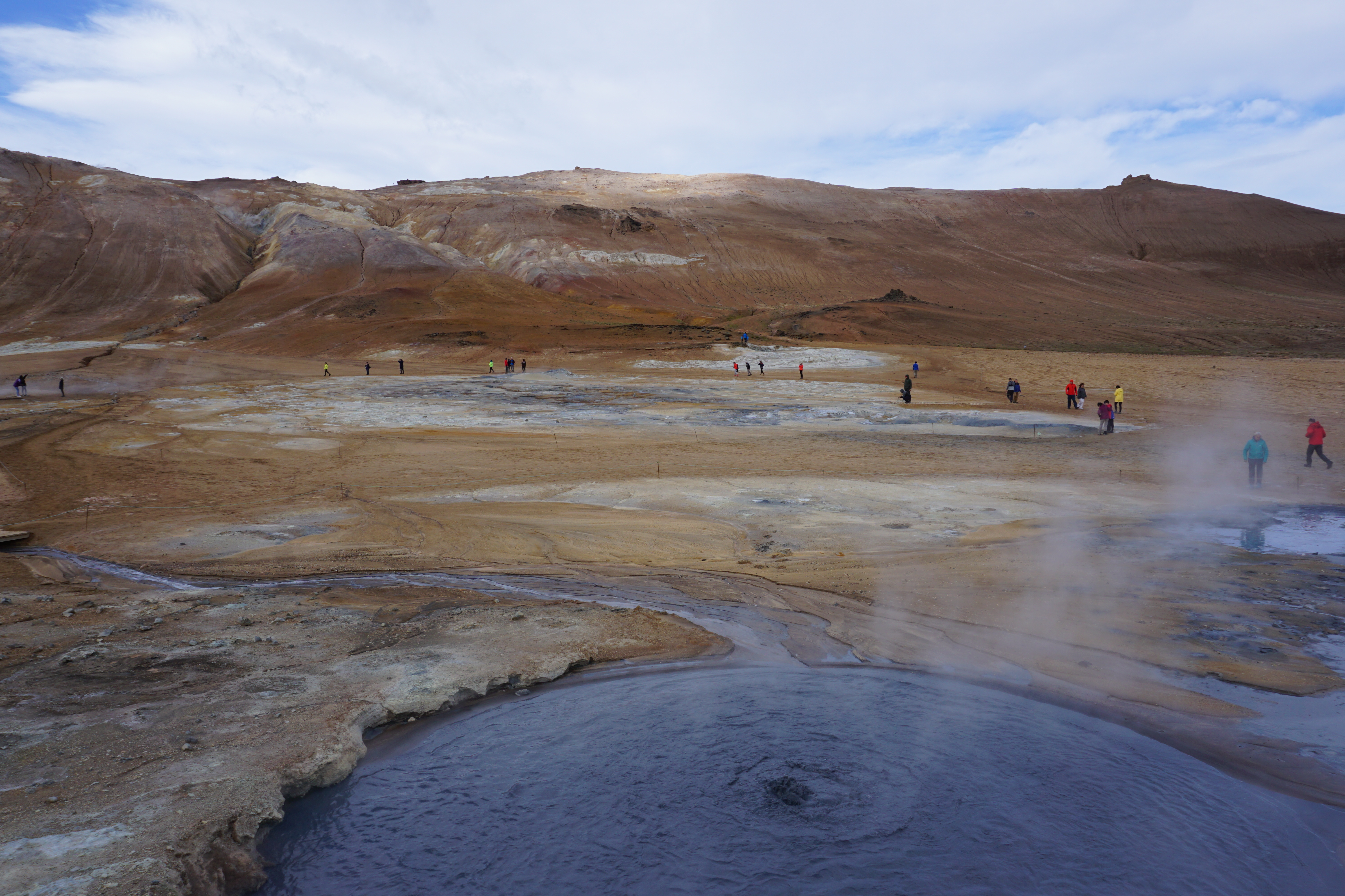 Der nächste Hot Spot waren schwefelhaltige Schlammlöcher, verteilt über einen großen Berghang. Hier wurde einmal Schwefel abgebaut, welcher zur Herstellung von Schießpulver exportiert wurde. Überbleibsel dieses Abbaus waren diese blaugefärbten, stinkenden, dampfenden und blubbernden Schlammlöchert.