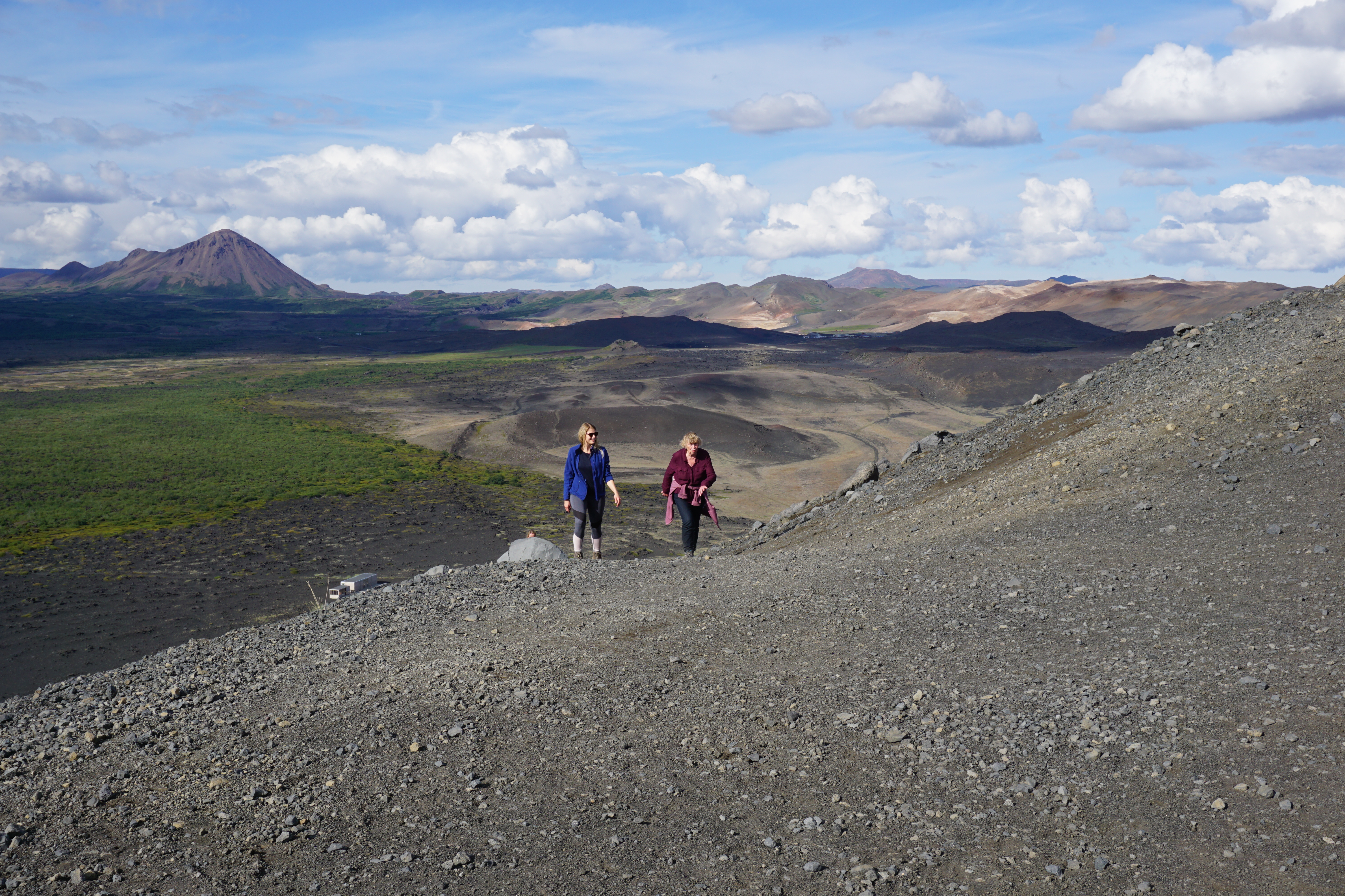 Der Vulkankrater Hverfjall lockte mit einem Aufstieg. Es war ein tolles Erlebnis in den Schlund des Vulkans hineinzuschauen. Wann sieht man als "Ottonormalverbraucher" schon so ein Bild. Deshalb habe ich als ältere Dame den Aufstieg auch in Angriff genommen. Die Jugend stürmte voran, der Herr Schwiegersohn heftete sich an meine Fersen. Ich schickt ihn aber auch zu der Jugend, damit er mein Keuchen nicht hören sollte. Natürlich verkündete er ganz laut seinen Nachkommen, dass Oma japst wie ein Elefant. Ich habe es aber trotzdem geschafft und wir sind alle mit einem wunderschönen Blick in und vom Berg belohnt worden.