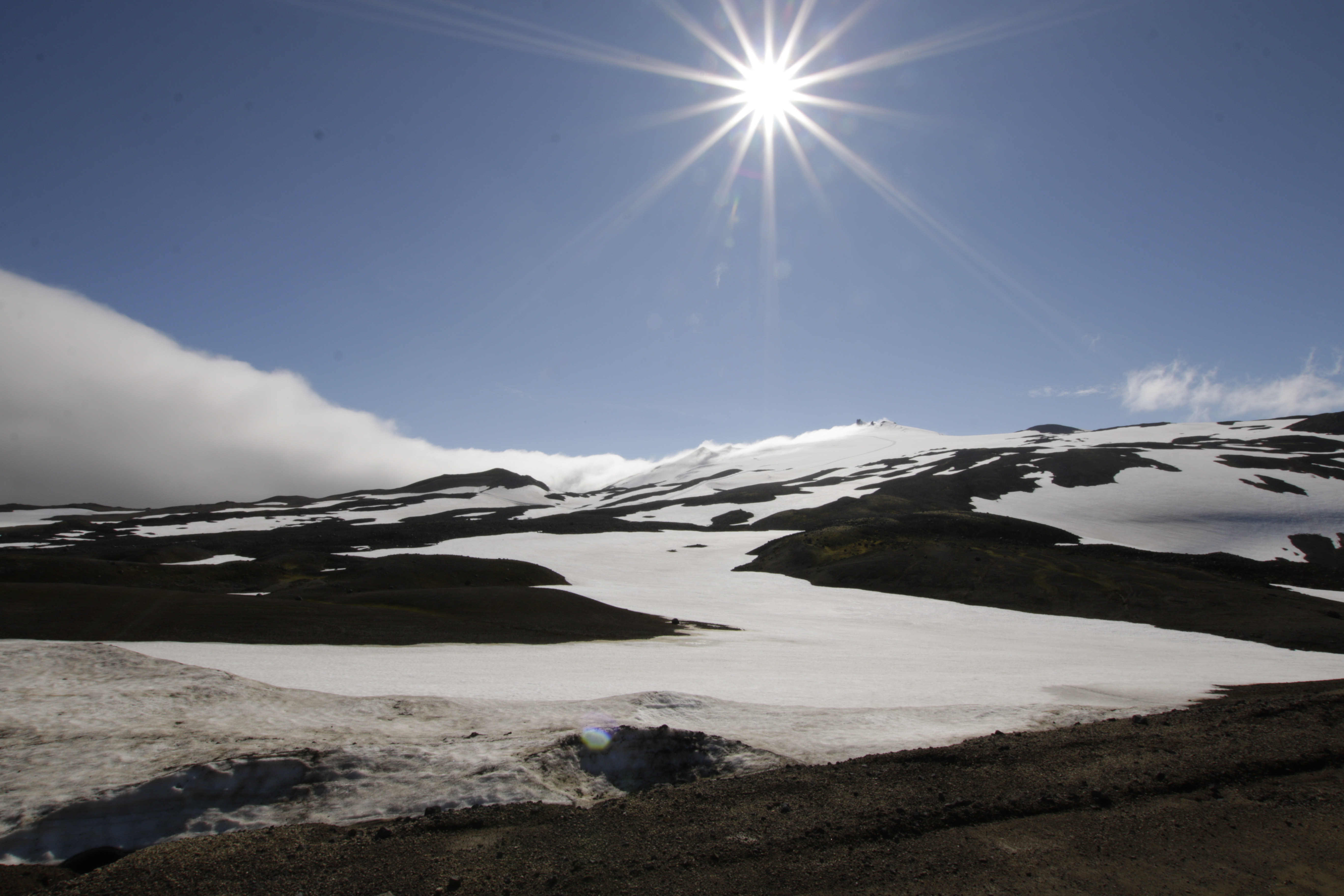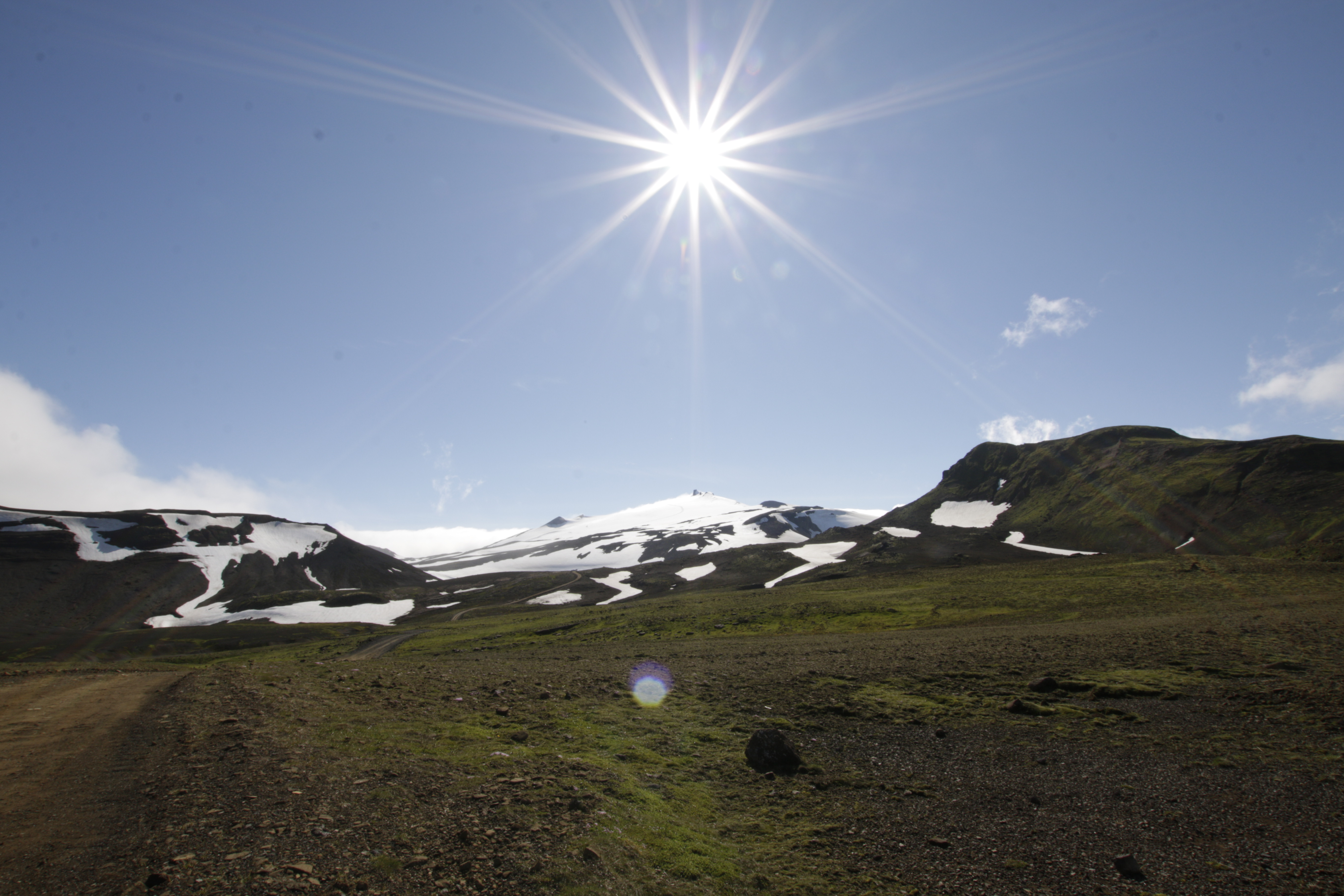Roland fuhr nun zum Gletscherfeld Snæfellsjökull über steile Pisten hinauf. Bei Sonnenschein und ruhigem Wetter konnten wir die Schneefelder an den Berghängen bestaunen und betreten. Es wurden natürlich wieder viele Aufnahmen gemacht. Doch diese herrliche Kulisse kann nicht darüber hinwegtäuschen, dass in ein paar Jahren, bei bleibendem Klima, die Berge und Berghänge einmal gletscherfrei sein werden.