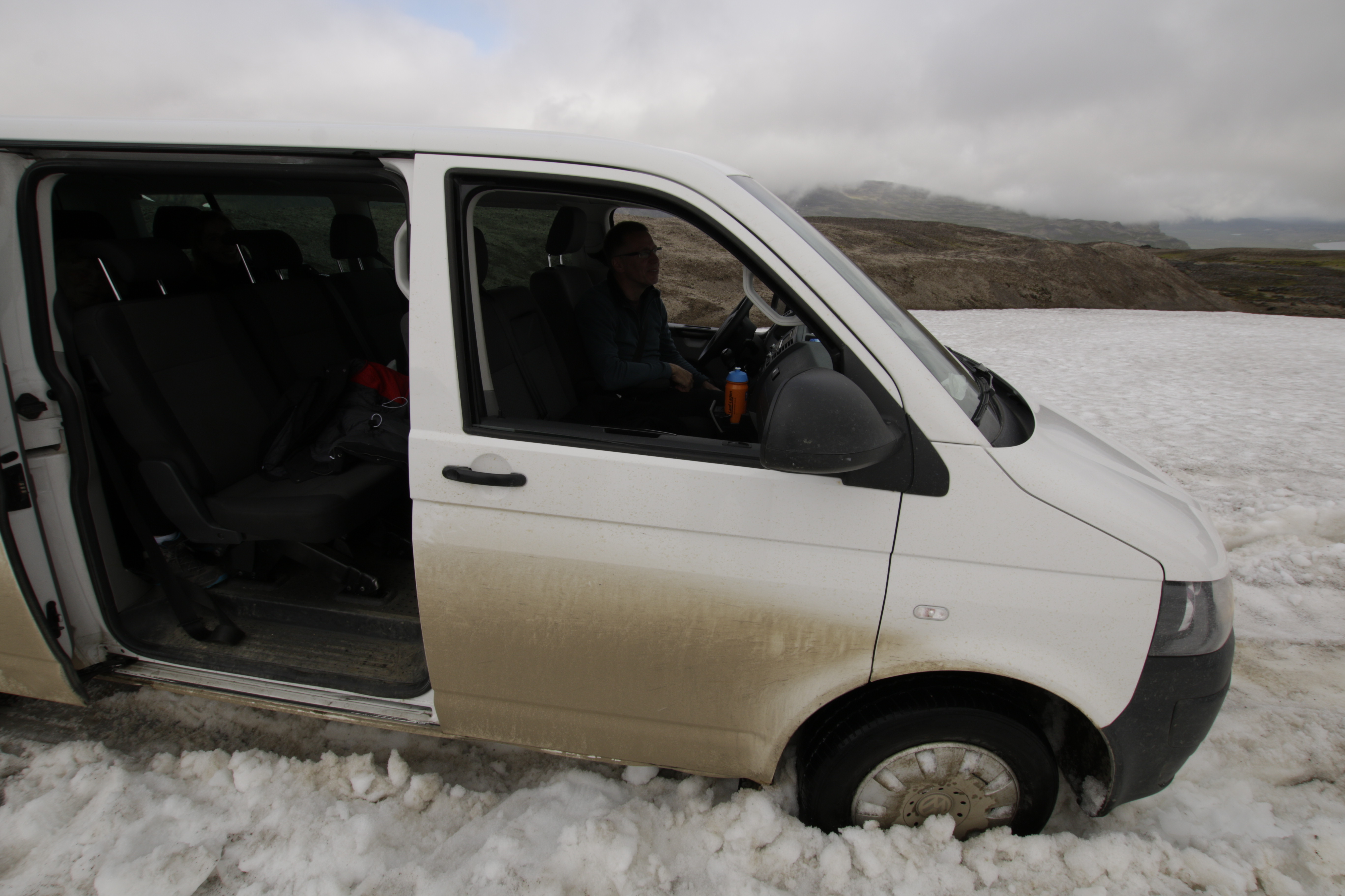 Dorothee stieg aus und sprang hin und her und gab Roland Anweisungen, wie er wieder flott werden konnte. Sie legte Lavakies unter die Räder, eine gute Idee. Aber unser Bus rührte sich nicht von der Stelle. Roland bat währenddessen Eric ein Bild zu machen, wie er im Eis feststeckt. Zum Glück kamen jetzt zwei Autos angefahren, die auch im Hochland waren. Sie wollten erst abdrehen, aber hatten wahrscheinlich unsere missliche Lage erkannt. Ein paar junge Leute und eine Schar Kinder packten am Auto an und Roland wurde samt Bus aus dem Schnee geschoben. Wir dankten unseren Helfern und konnten nun, fröhlich über die geglückte Rettung, weiterfahren.