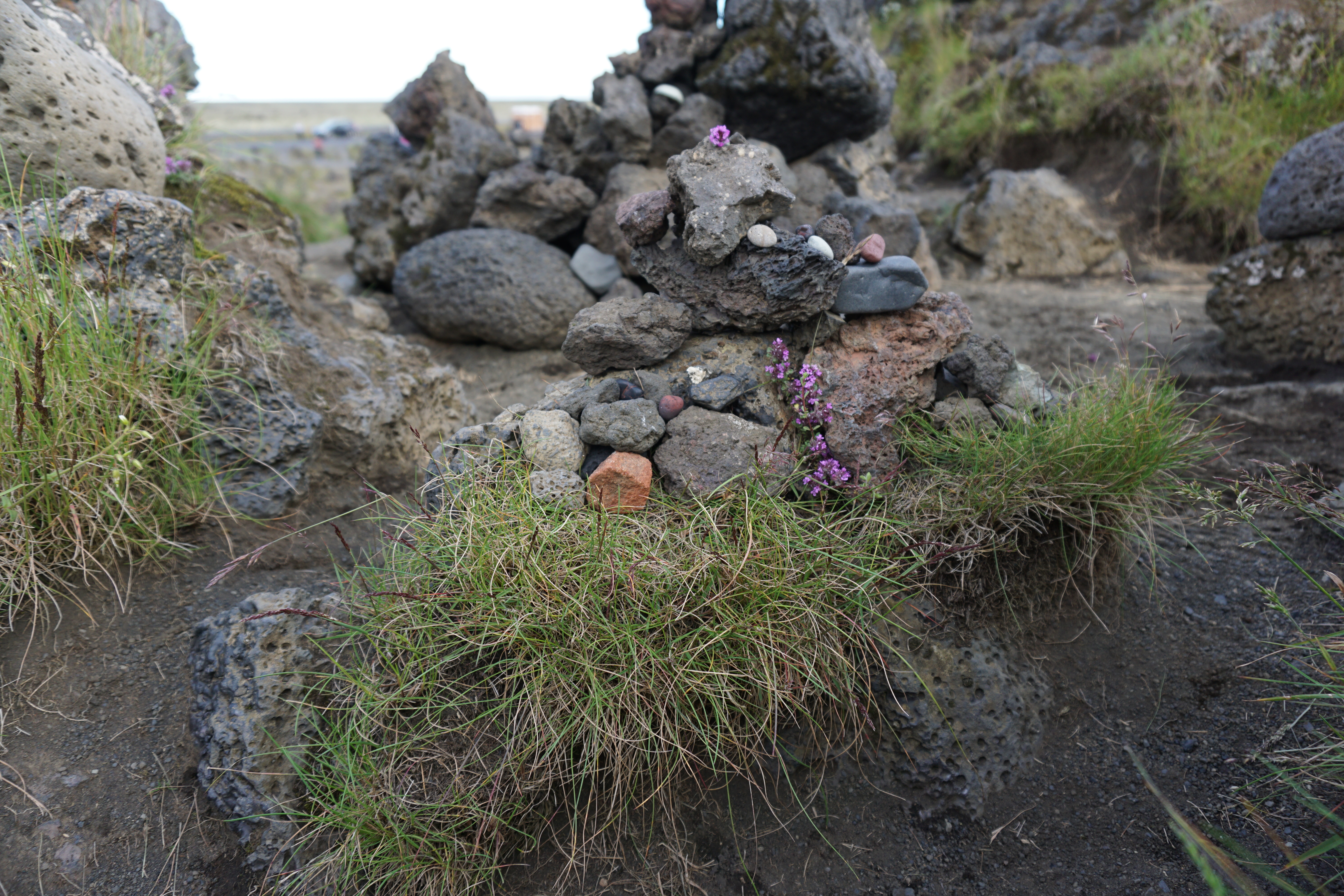An einer anderen Stelle des Lavafeldes entdeckten wir kleine schwarze Türmchen. Sie sind von den Reisenden aus verschiedenen Steinen zu Pyramiden gebaut worden. Eine Schautafel erzählt (auch in deutsch) davon, dass hier einmal ein Bauerngehöft von einem Vulkanausbruch zerstört wurden ist. Zum Gedenken daran erstellen die Touristen diese kleinen Felsgebilde, welche ihnen aber auch eine glückliche Reise bescheren sollen. Nachdem auch wir unser Türmchen errichtet hatten, hatte unsere Reisegruppe für den heutigen Tag genug gesehen.