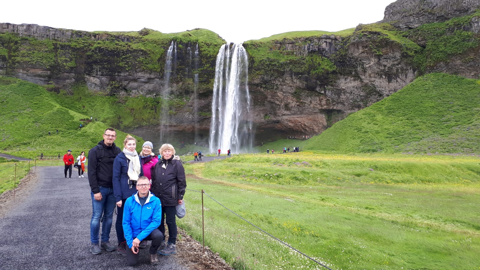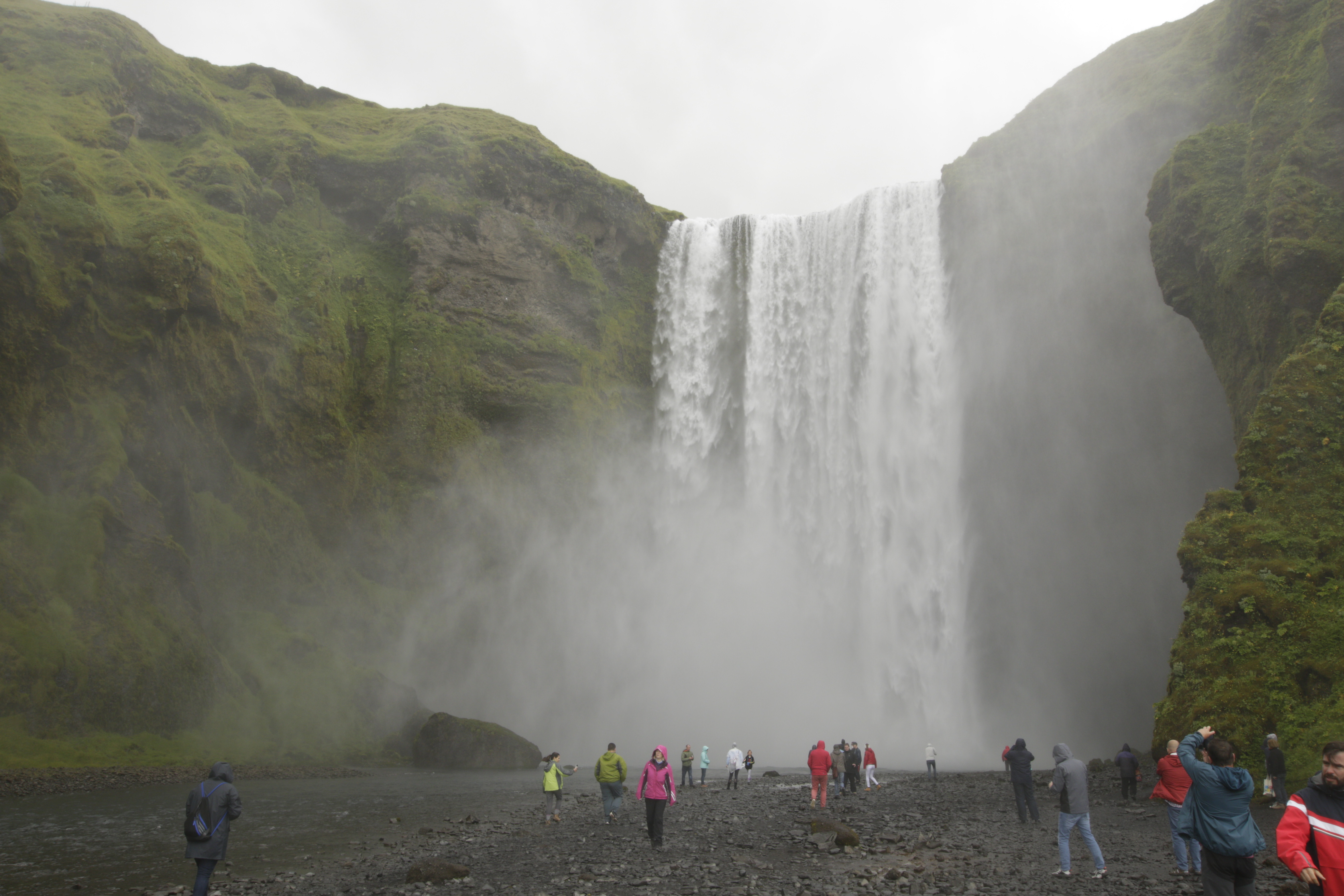 Eric fuhr uns zum Wasserfall Seljalandsfoss. Bei diesem Fall konnten wir auch die Rückseite betreten. Die Felswand war aufgrund der hohen Luftfeuchtigkeit mit Flechten, Moosen und Farnen bedeckt.