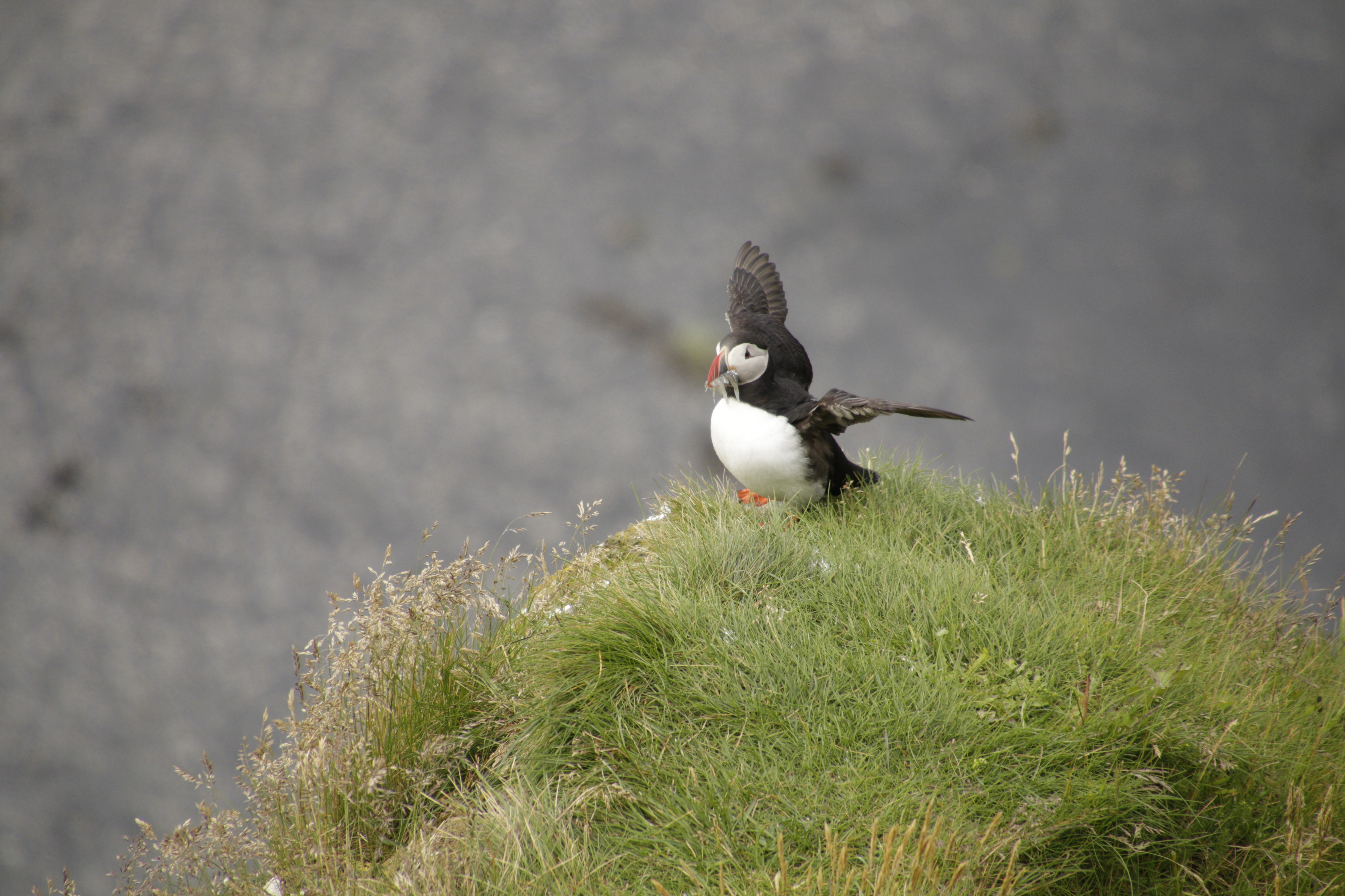Die Fahrt ging weiter zur südlichsten Stelle Islands. Von der Höhe eines Felsens, der auch an den Wänden begrünt war, konnten wir Papageientaucher, diese bunten kleinen Vögel, beim An- und Abflug zuschauen. Sie nisteten in der Felswand und sind so relativ sicher vor Feinden. Doch Raubmöwen können ihre Eier und ihre Brut trotzdem gefährden. Der Blick in die Runde fiel auf bizarres Felsgestein, welches sich in den blauen Himmel reckte. Mehrere Felsbögen überbrückten das Ufer des Atlantiks. Lange schwarze Sandstrände erfreuten unseren Blick. Auf dem Felsplateau hatten sich viele hellrosa Graslilienpolster ausgebreitet. Am Strand, zwischen riesigen Felsbrocken und kleineren plattgeschliffenen Steinen, legten wir unsere Kaffeepause ein. Dorothee hatte leckeren Schokoladenkuchen gebacken.