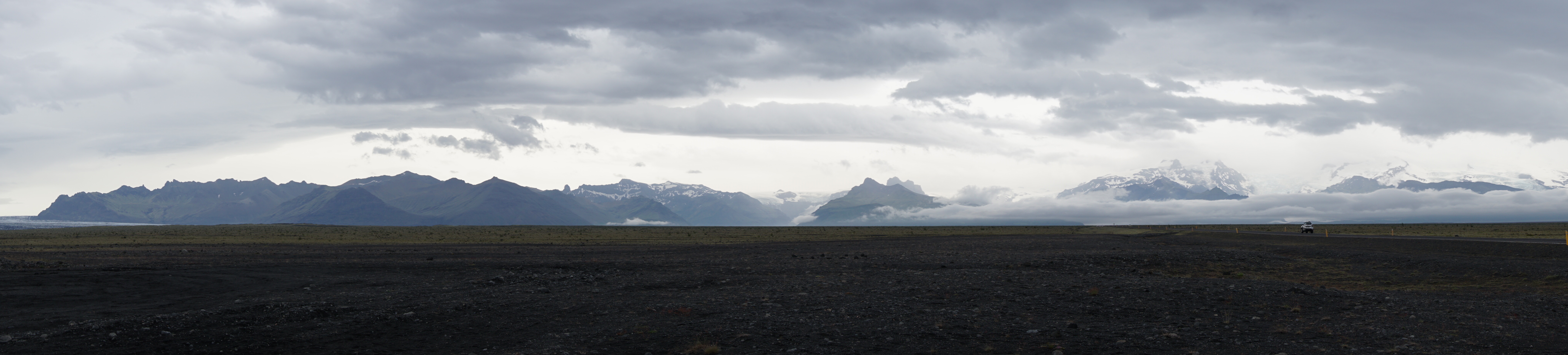 Nach mehreren Stunden Fahrt, war unser erster Hot Spot das Toillettenhäuschen. Diese Häuschen sind praktischerweise an vielbefahrenen Stellen nutzbar. Dann erreichten wir den Vatnajökull Nationalpark. Hohe Berge mit aus dem Nebel ragenden Spitzen begrüßten uns. Nach einem kurzen Fotostop hatten die Wolken die ganzen Berge schon wieder eingehüllt und unsichtbar gemacht. Dann parkten wir am Svartifoss-Wasserfall. Doch hier hätten wir mindestens zwei Stunden Zeit haben müssen (Weg hin und zurück). Da wir aber noch eine lange Fahrt vor uns hatten, mussten wir dieses Unterfangen aufgeben.